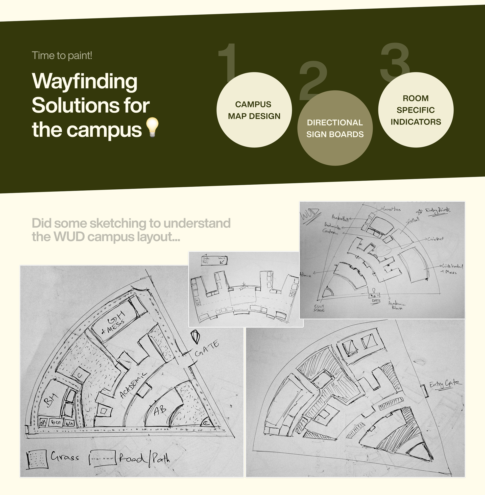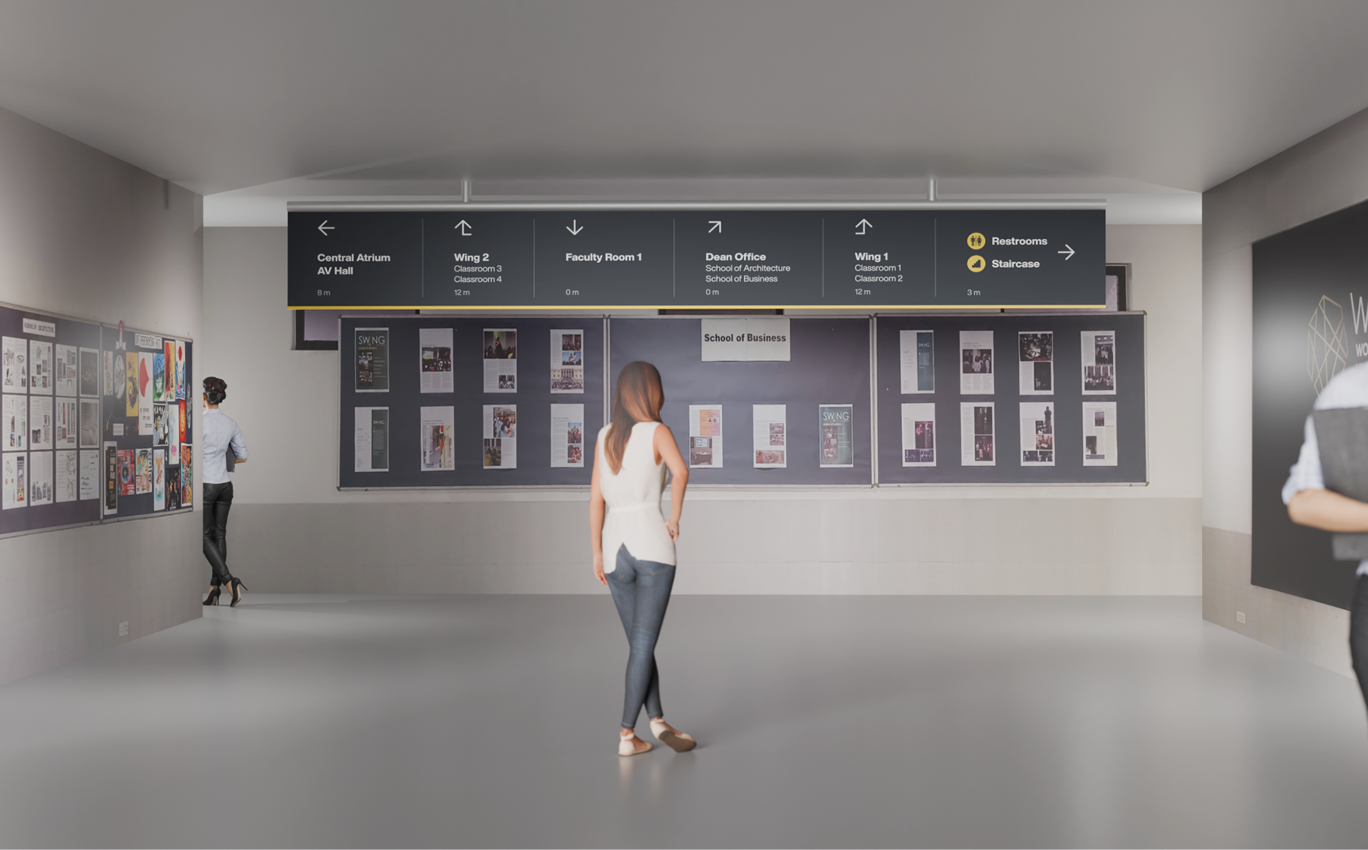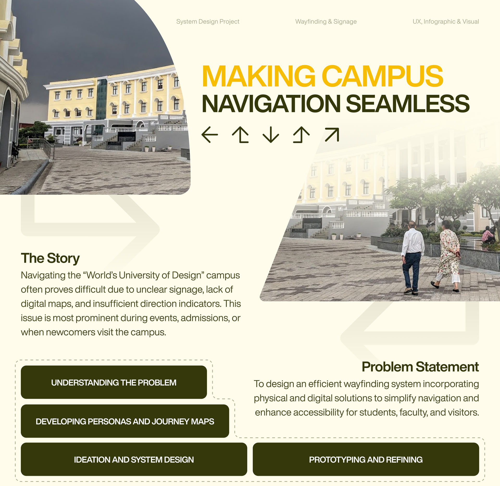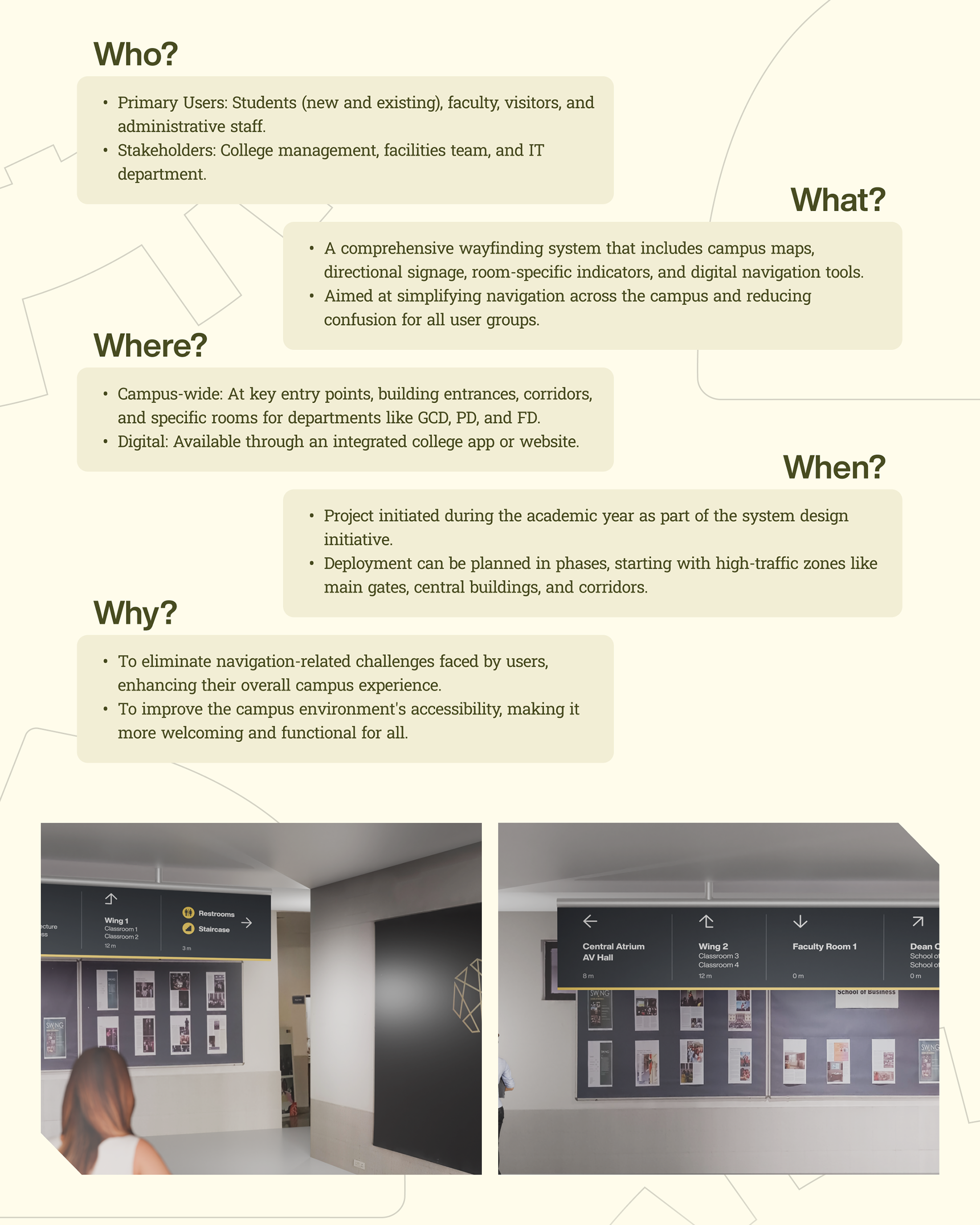This project focuses on designing an intuitive wayfinding system for our college campus to address navigation challenges faced by students, faculty, and visitors. By analyzing the current pain points and incorporating user-centric solutions such as clear signage, campus maps, and directional indicators, the system aims to enhance navigation efficiency and improve the overall user experience.