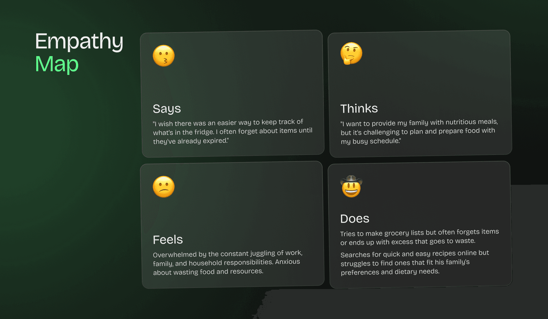 Many households struggle with food waste, poor inventory tracking, and inefficient planning. Traditional ways of managing kitchen supplies and appliances rely heavily on memory or manual processes, which often leads to overbuying, spoilage, or under-utilization of items. Additionally, users lack real-time insights into their kitchen’s usage, making it difficult to make data-driven decisions about what to cook, when to shop, or how to minimize waste.