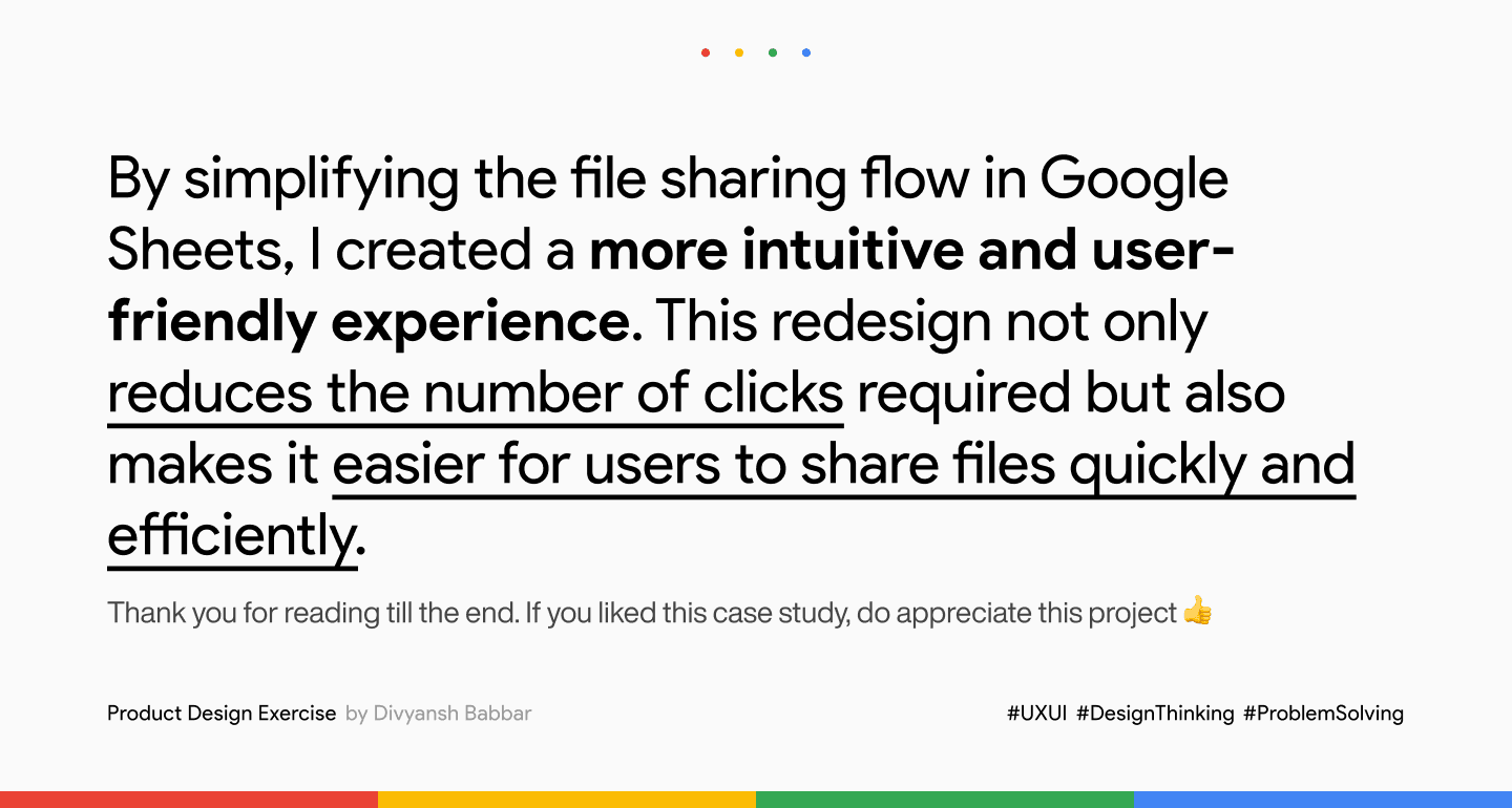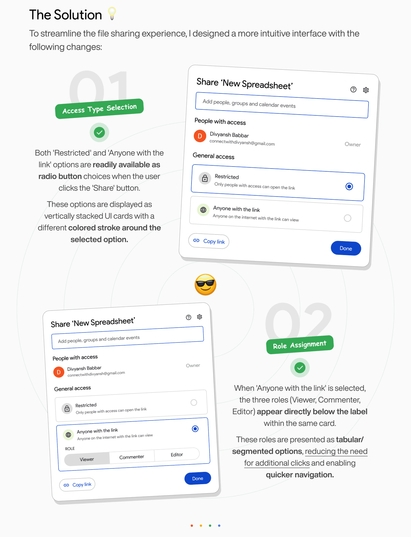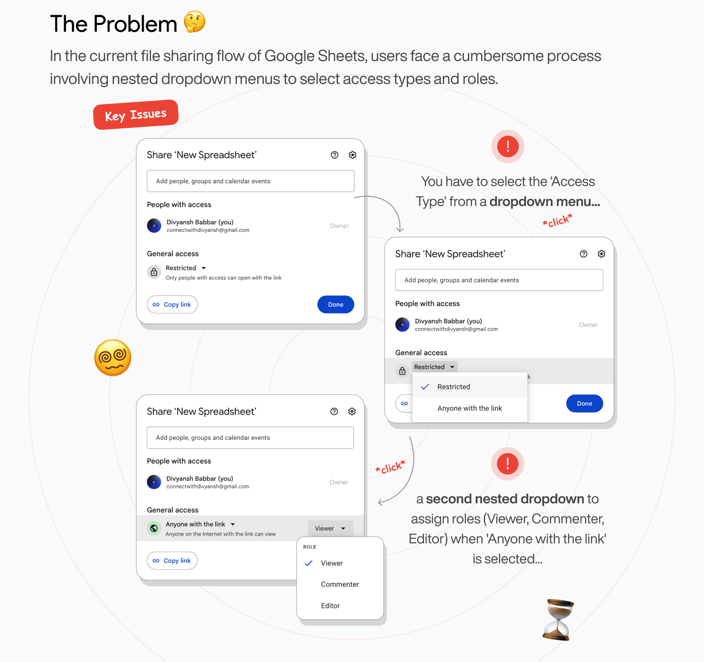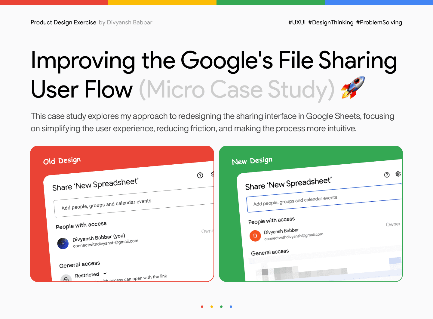 This project investigates and redesigns Google’s file-sharing user flow to make collaboration smoother, more intuitive, and efficient. The core focus is on lowering friction when sharing files or folders, clarifying permission levels, and providing clear feedback to users at every step.